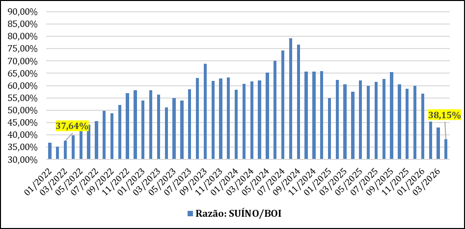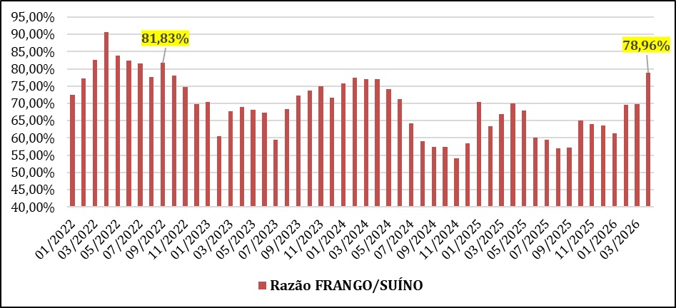 No acumulado de abril/26, a queda acentuada do preço do suíno, concomitante à alta do boi gordo fez com que a competitividade da carcaça suína em relação à bovina atingisse o melhor patamar desde março de 2022 (gráfico 3). Por outro lado, em relação ao frango resfriado a competitividade da carcaça suína em abril/26 é a melhor desde setembro de 2022 (gráfico 4). Ou seja, no atacado o suíno está relativamente barato em relação ao boi e ao frango. Estas correlações não obrigatoriamente se repetem no varejo na mesma proporção, pois cada proteína e cada elo da cadeia de valor tem sua dinâmica, mas a tendência é que o consumidor, em algum momento, identifique estas diferenças que podem pesar na sua escolha.