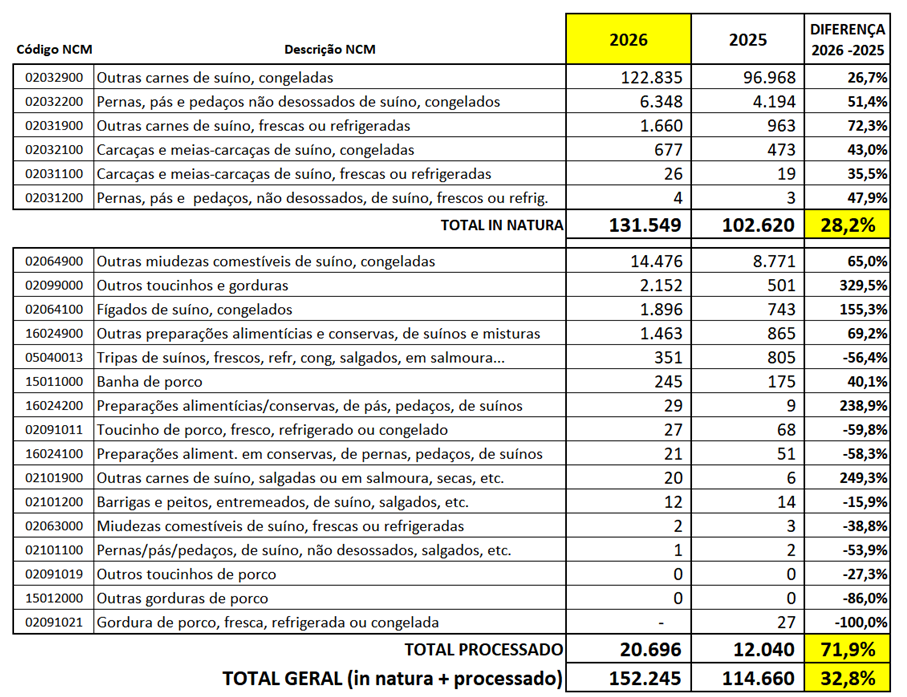 O Brasil segue mantendo crescimento significativo de exportações de carne suína. Em março deste ano o país exportou 152,2 mil toneladas entre in natura e processados (tabela 1), 32,8% acima do embarcado em março/25. O volume ficou 1,4% superior ao até então recorde mensal, que havia sido atingido em setembro/25. Março também foi o mês com a maior média diária embarcada de carne suína in natura (5.980 toneladas/dia útil), a maior da série histórica da Secex, iniciada em 1997.